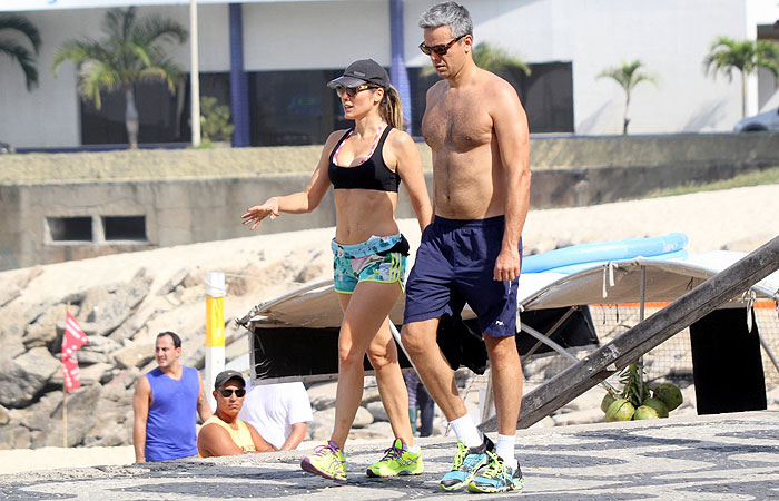 Otaviano Costa é visto caminhando com Flávia Alessandra na orla da praia do Leblon na manhã deste sábado.